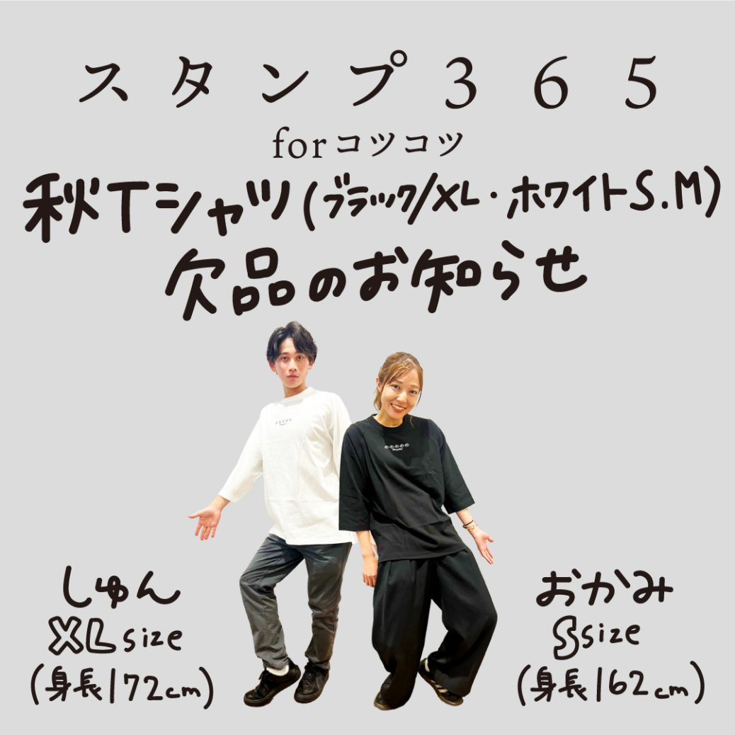 2025.10.162025.10.16, スタンプ365, 広報からのお知らせ 誠に申し訳ございませんが、 ・ブラック/XL ・ホワイト/S ・ホワイト/M がメーカー欠品のため、ご用意できません。 上記のカラー/サイズをお選びいただいた方に関しましては、長袖Tシャツ(2023秋のTシャツと同じ形)でご対応をさせていただきます。 ご了承くださいませ。 ※その他サイズは変更なくご対応させていただきます。