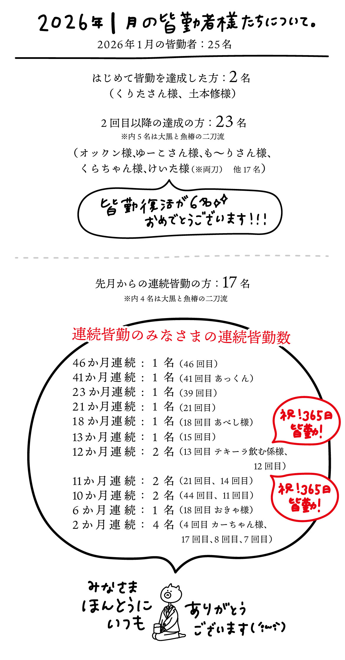 今月も皆勤者数発表の